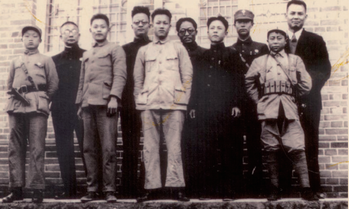 △在南京十人合影——1937年叶剑英、李克农与八路军驻南京办事处工作人员合影。由左至右:吴志坚、李克农、李应吉、秦邦宪、康一民、齐光、童小鹏、袁超俊、叶剑英。(左起第九人为警卫员)