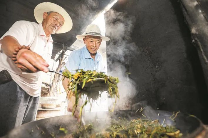 上午7时,拎着满满的一口袋“收获”到家后,这采茶的第一道工序才算结束。接下来,还要将剪切配好的叶片用水冲洗干净,放入锅中蒸,等叶片变色后,取出晾干,然后倒入地锅,不停地翻炒,直到水汽全部蒸发。完全炒干的茶叶可以存放很久。用石靖忠的话说,每一片茶叶都经历了“千锤百炼”,都离不开老百姓的勤劳和智慧。