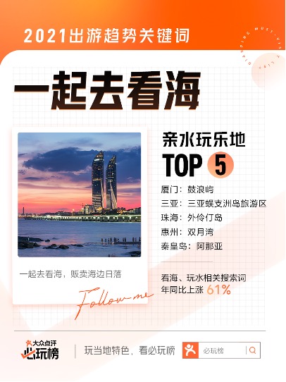据了解,大众点评发布的“2021年出游趋势关键词”显示,海景酒店相关搜索词年同比上涨63%,三亚亚特兰蒂斯酒店、大连一方城堡豪华精选酒店、青岛红树林度假世界珊瑚酒店、深圳大梅沙京基洲际度假酒店、惠州双月湾檀悦都喜天丽度假酒店入选热门无敌海景酒店TOP5。结合年轻人呈现的玩乐新趋势,2021年“必玩榜”在经典景区地标的基础上,丰富了极具当地特色的酒吧、书店、茶馆、演出场馆、展览等类型。从整体来看,三亚共25家玩乐目的地上榜,近半属于海岛自然风光。除了海棠湾、凤凰岛等风光旖旎的海景地标外,后海村、三亚水稻国家公园也成为新晋的必玩目的地。必玩榜揭示了2021年出游的新趋势。数据显示,看海、玩水相关搜索词年同比上涨61%,三亚蜈支洲岛旅游区成为“必玩榜”中第二热门的亲水玩乐地。