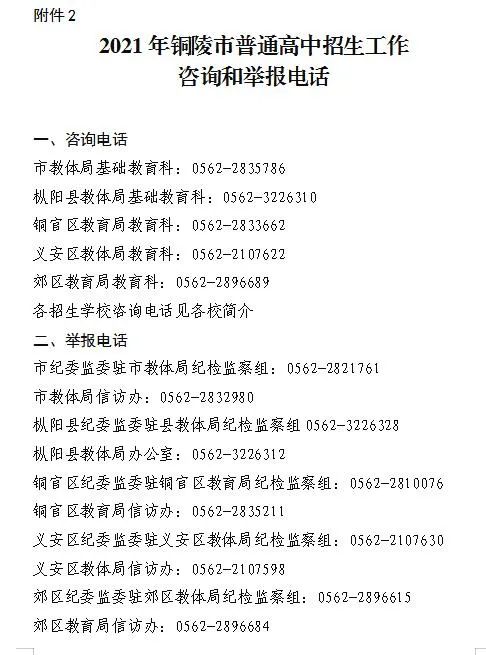 2.2021年铜陵市普通高中招生工作咨询和举报电话