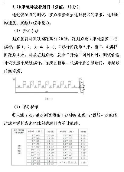 (1)颠球、20米运球过杆射门、定点传球;