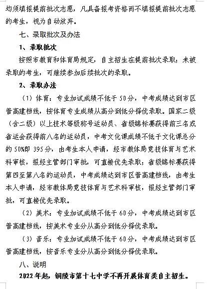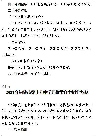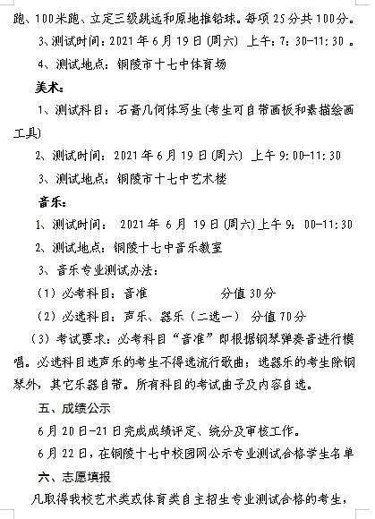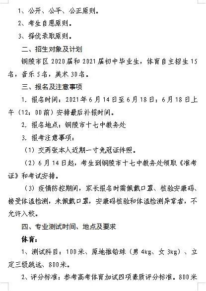 4.2021年铜陵市第十七中学艺体类自主招生方案