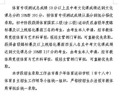 1.田径:自主招生专业成绩不低于55分,中考文化课成绩不低于文化课总分的65%即513.5分(2020届初中毕业生录取分数比应届生提高30分),文化课成绩达标后,按学校自主招生考试专业成绩从高分到低分择优录取。达到田径国家二级运动员标准以上的考生,学校组织专项复试合格,中考成绩达到市区普高建档线的,报市教体局审批后可直接优先录取。