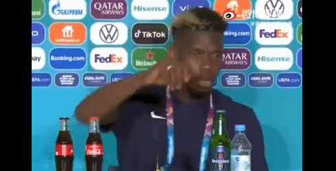 值得注意的是,在法国队与德国队比赛的赛前发布会上,法国队中场球星博格巴也模仿起了C罗——他在发布会移走了面前的赞助商啤酒。