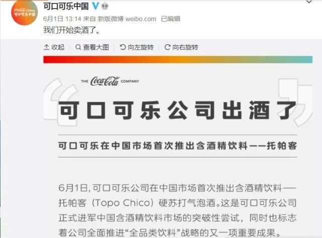 今年6月1日,可口可乐公司在其官方微博上宣布,在中国市场首次推出含酒精饮料——托帕客(Topo Chico)硬苏打气泡酒。