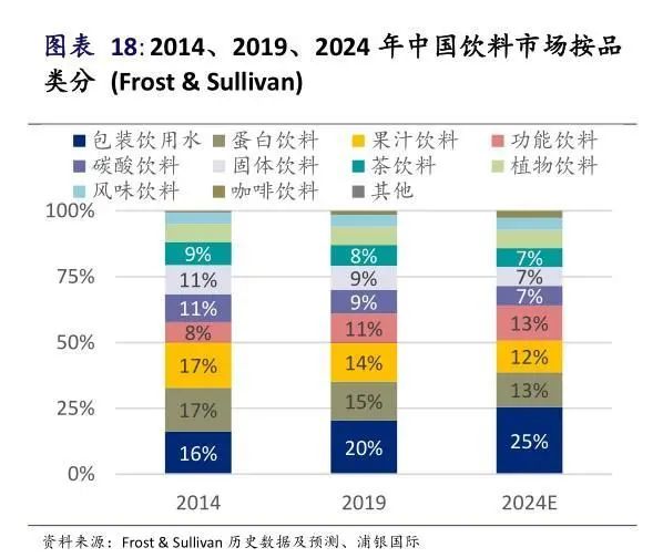 据浦银国际证券2020年发布的一份行业研报显示,2014-2019年,无糖茶、咖啡饮料、天然水和天然矿泉水是中国饮料市场市场增长最快的品类,而碳酸饮料的市场则处于不断收缩的趋势,预计到2024年,碳酸饮料市场占比将收缩至7%。