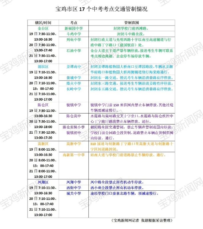 宝鸡新闻网记者特别联系了金台、渭滨、高新、陈仓、凤翔大队,为考生整理了市区17个考点门前的道路交通管制信息,提醒准备驾车出行的朋友最好提前择路绕行,一旦途经考点周边道路请勿鸣笛,为考生提供安静的应考环境。