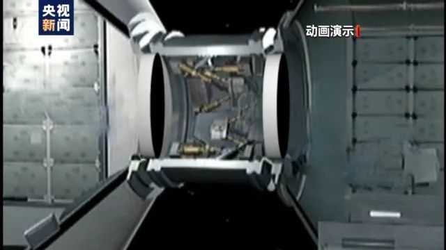 此时的航天员,由于不受重力的限制,是漂浮在对接通道里,用力将“钥匙”旋转两圈半,就能够将门推开进入节点舱。