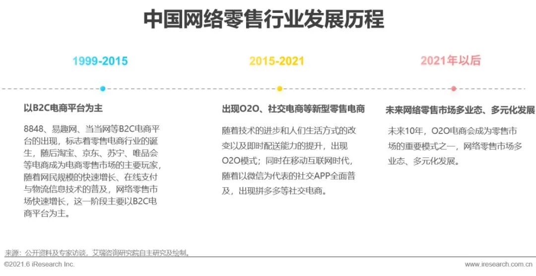 20年前, 8848、易趣网、当当网等B2C电商的出现,标志着零售电商模式的诞生,随后淘宝、京东、苏宁、唯品会等电商成为电商零售市场的主要玩家;随着网民规模的快速增长、在线支付与物流信息技术的普及,网络零售市场快速增长,这一阶段主要以B2C、C2C电商平台为主。过去十年来,随着技术的进步和人们生活方式的改变以及即时配送能力的提升,O2O模式出现并逐渐成熟;未来一段时间,随着消费者的线上消费、即时性消费习惯逐步养成,以及线上线下全渠道零售融合发展,O2O电商也将成为网络零售市场的重要模式之一。