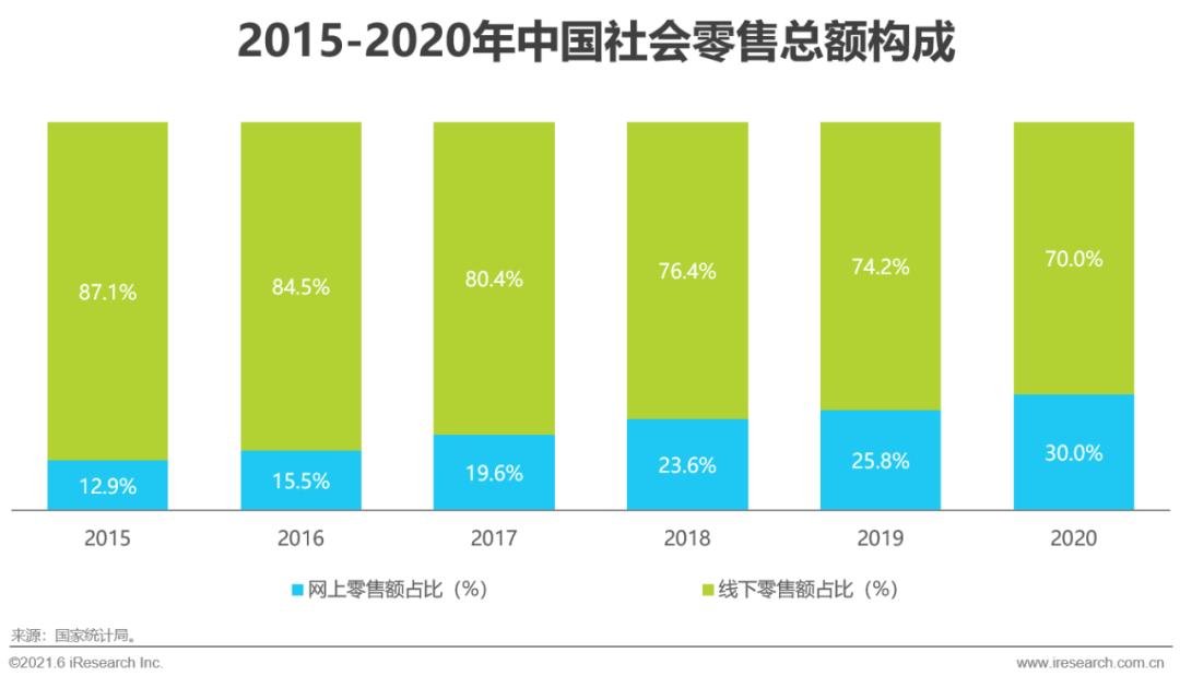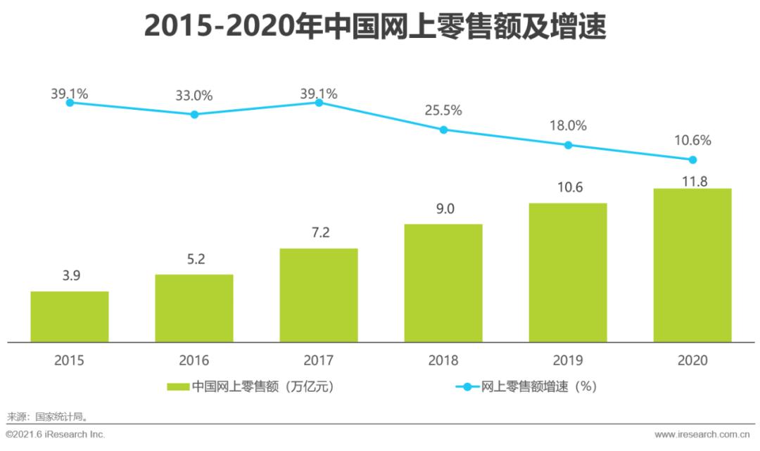 近年来,我国网络零售市场发展持续向好,2020年面对疫情巨大的冲击,我国网络零售市场保持稳健增长,市场规模再创新高。根据国家统计局数据显示,2020年中国网上零售额达11.8万亿元,较2019年增长10.6%。从社会零售总额的构成来看,近年来我国线上消费占比持续扩大,线上零售已逐渐成熟,但线下零售市场仍占据大部分市场份额,线下实体门店仍是零售主体,线上化率仍具有较大提升空间。