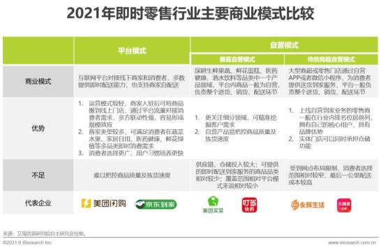 中国即时零售行业内玩家主要分为两种商业模式:平台模式和自营模式。平台模式即时零售电商不直接拥有商品,通常依托互联网能力将线下的商家商品和线上的消费需求形成链接,部分提供线下即时配送运力服务;自营模式多出现在垂直零售行业,对商品和供应链的控制能力较强。