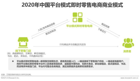 平台模式即时零售电商属于轻资产运营的模式,一般背靠互联网生态,通常依托互联网能力将线下的商家商品和线上的消费需求形成链接,消费者下单后由即时配送员到附近商家取货,1小时内配送给消费者。此外,平台模式即时零售电商中入驻商家类型较多,涵盖超市便利店、生鲜水果店、鲜花绿植店、甜点蛋糕店、书店、药店等多种类型门店,平台内可整合各类商品,满足消费者多品类即时消费需求。