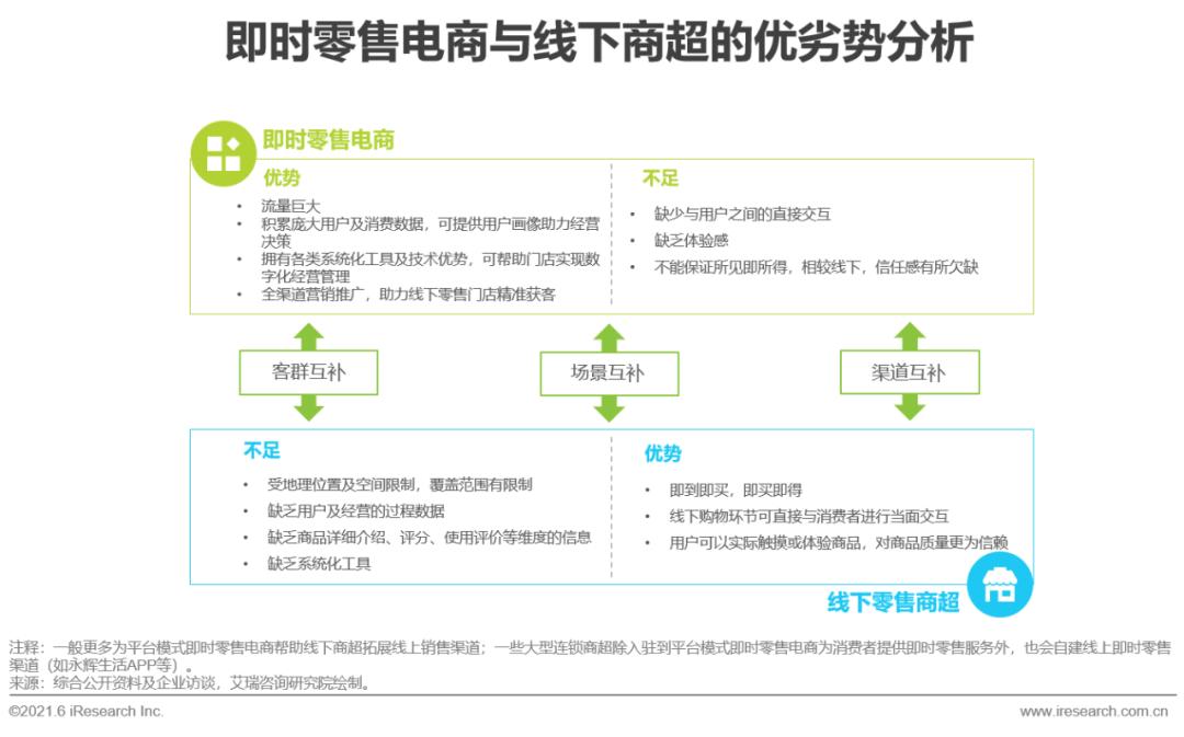 商超在即时零售电商拓展线上销售渠道与商超线下销售渠道优劣势各异,在客群、场景、渠道三大方面均存在明显的互补关系。美团闪购等即时零售电商拥有较大的流量,可以帮助零售商超拓展线上销售渠道,触达更多的消费人群,并可以帮助商超全渠道营销推广,精准获客;商超线下零售渠道则具有即买即得、用户可以实际触摸或体验商品,对商品信赖度高等优势。线上线下融合,可以让零售商超更好地满足消费者的多样化需求。