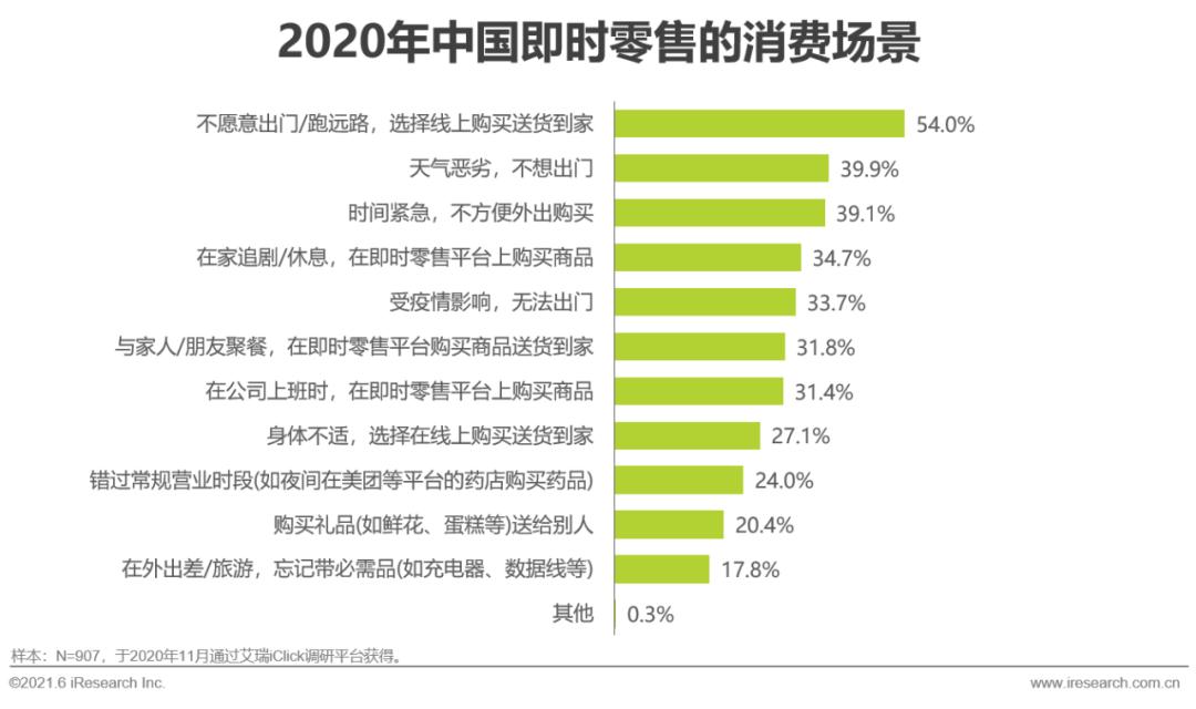 随着消费者需求的变化及行业的发展,线上线下逐渐融合,消费场景越来越多元化。艾瑞调研数据显示,不愿意出门/跑远路、遇恶劣天气及时间紧急不方便出门购买是用户在即时零售电商平台消费的最主要的原因;此外,与朋友/家人聚餐时以及在公司工作时也是即时零售较为常见的消费场景。