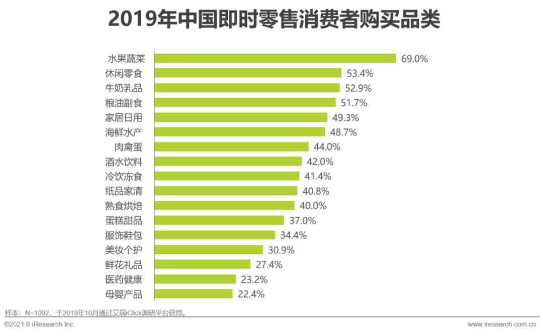 就购买品类而言,水果蔬菜、休闲零食、牛奶乳品、肉禽蛋等生鲜食品是用户在即时零售电商平台最常购买的品类。对比2019年来看,水果蔬菜、休闲零食、肉禽蛋、医药健康等品类购买人群占比增加,随着即时零售电商销售品类的逐渐扩充,消费者可购买的品类也越来越多。