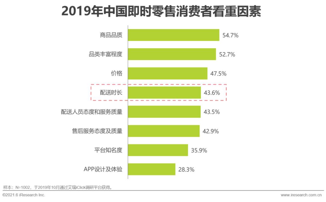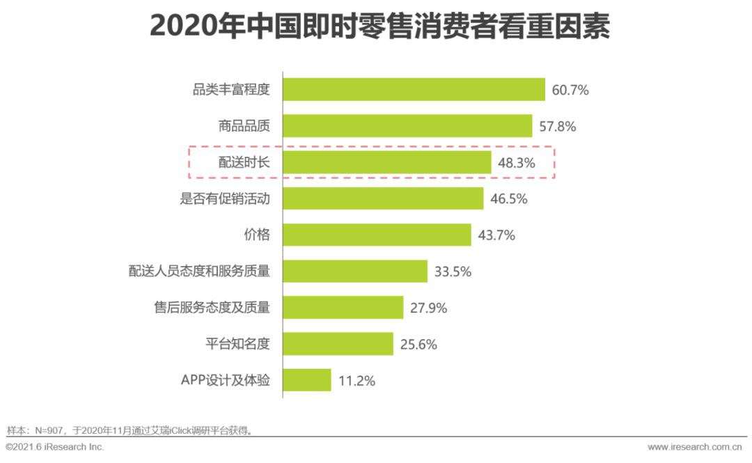 当前,人们的生活节奏加快,衣食住行各方面都追求“方便、快捷”。消费者在购物时越来越注重配送的时效性。艾瑞调研数据显示,2019年43.6%的即时零售消费者更看重配送时长,2020年消费时看重配送时长的即时零售消费者占比达48.3%,选择该因素的消费者占比排名从2019年的第四名升至2020年的第三名。由此可见,配送时效愈发成为消费者在即时零售电商平台消费时考量的重点。