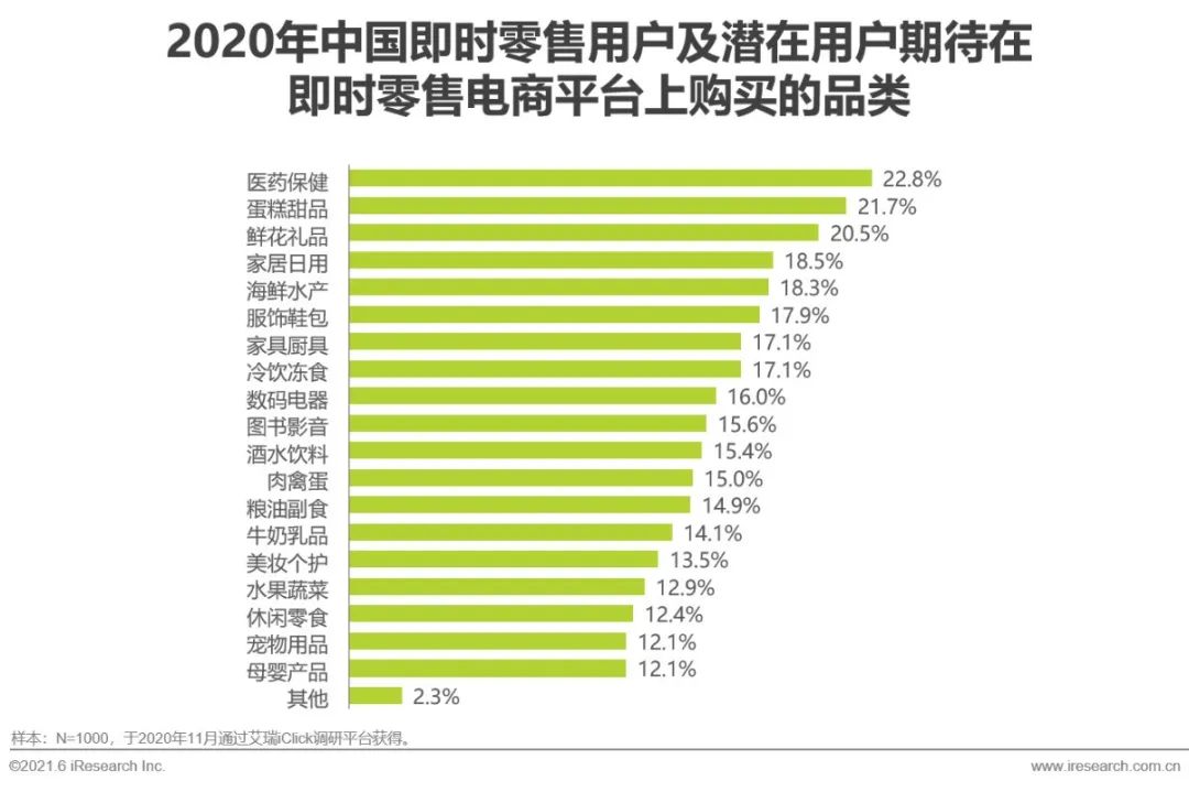 疫情催化了消费者本地即时零售需求,大大加速了消费者教育进程,消费者的即时性需求大幅提升。随着消费者消费习惯的变化以及行业的发展,即时零售电商可购买的品类也在不断扩展。从需求端来看,根据艾瑞调研数据,消费者期待在即时零售电商平台上购买的品类占比相对均衡,对各类商品都有即时消费需求;从供给端来看,当下本地生活服务已从餐饮外卖延伸至生鲜水果、家居日用、鲜花礼品、医药健康、图书文创等各类商品,即时零售场景也涵盖商超、便利店、药店、书店等线下场所,万物到家新时代将加速到来。