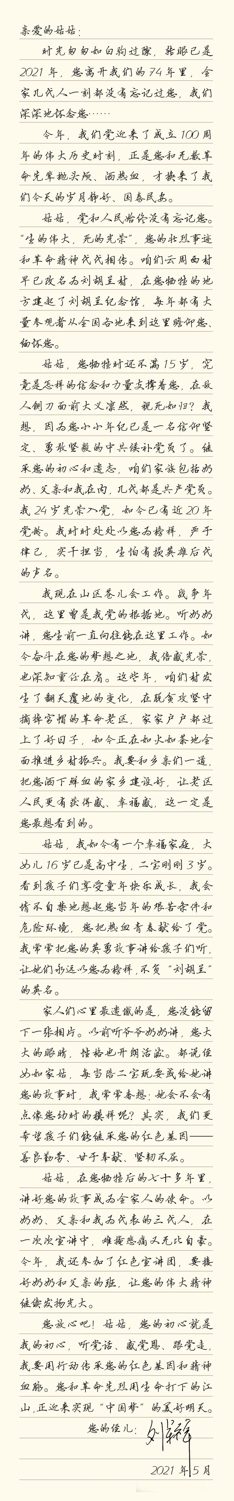 尽管从未见过姑姑,甚至连姑姑的长相都无从得知,但姑姑的形象在刘军祥脑海中被想象过无数次。每当看到大女儿用功读书的身影,听到小女儿嬉戏玩耍的声音,他总会不由地联想到姑姑。“她牺牲时还不满15岁,也是个孩子啊!究竟是怎样的信念让她面临生死抉择时,能如此坚贞不屈,毅然从容赴死,真的太伟大了……”