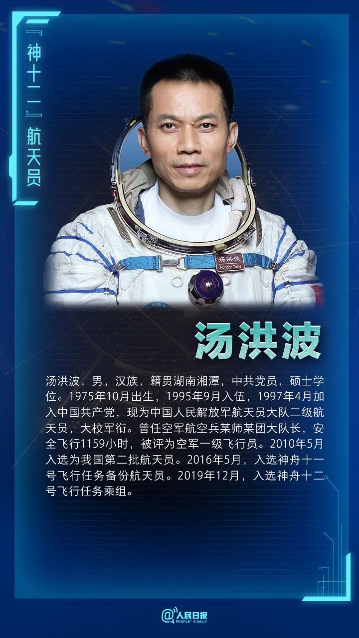 三名航天员中,特级航天员聂海胜参加过神舟六号、神舟十号载人飞行任务,特级航天员刘伯明参加过神舟七号载人飞行任务,二级航天员汤洪波是首次飞行。