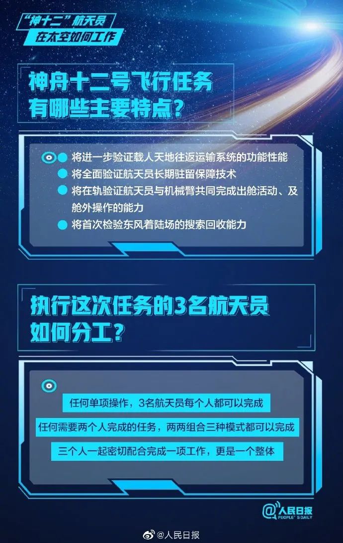 按计划,神舟十二号飞船入轨后,将采用自主快速交会对接模式对接于天和核心舱的前向端口,与天和核心舱、天舟二号货运飞船形成组合体。航天员进驻核心舱,执行天地同步作息制度进行工作生活,驻留约3个月后,搭乘飞船返回舱返回东风着陆场。