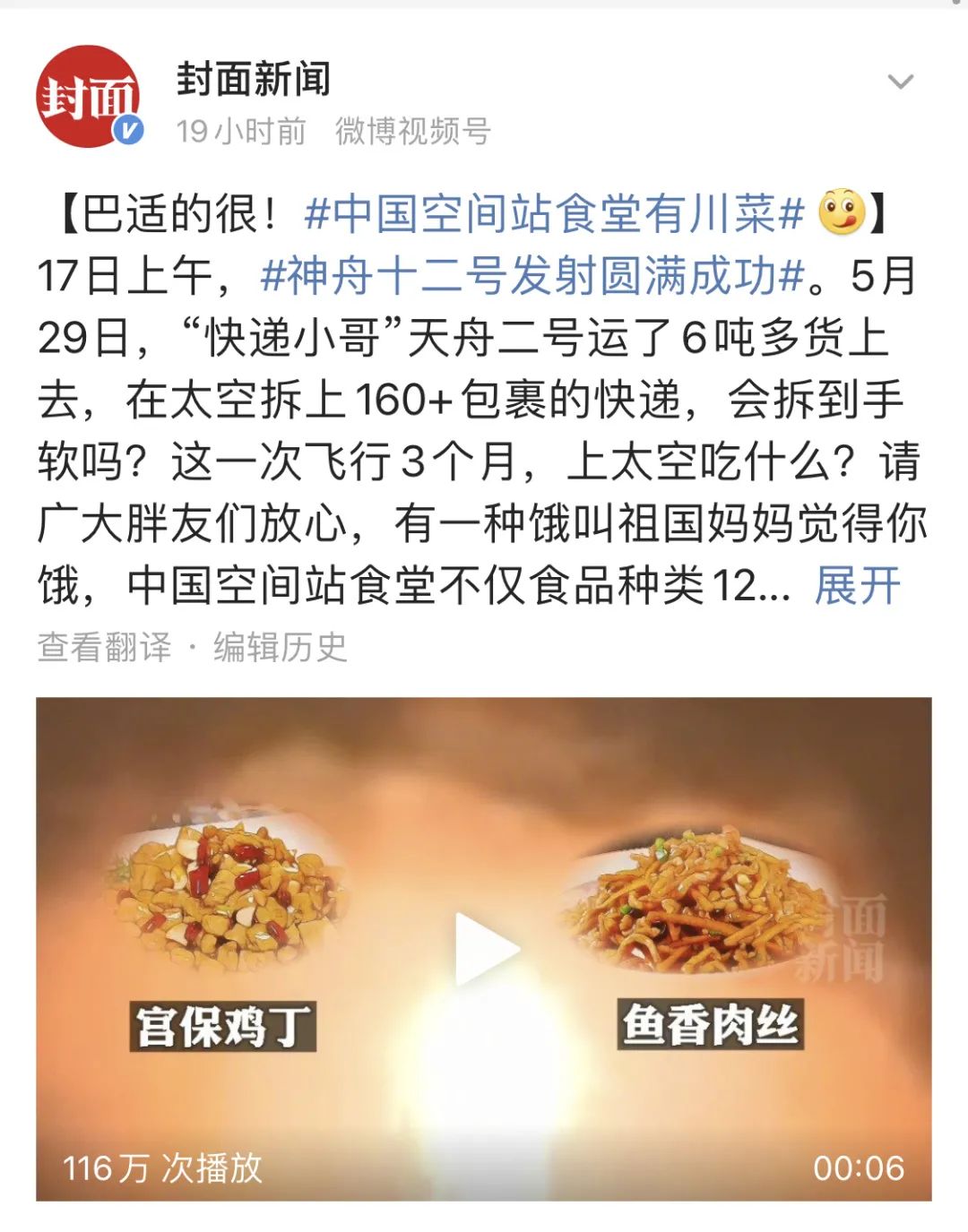 激动地看完直播,在朋友圈一众欢呼雀跃中,突然蹦出一个可爱的消息:巴适滴很!#中国空间站食堂有川菜#