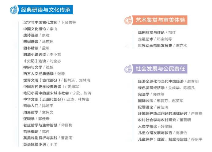 经过专家精心遴选,第一批通识教育核心课程共有55门,这些课程是学生们口口相传的“好课”,是学校通识教育课程建设的优秀成果,可谓是北师大的“宝藏”课程,来一起看看这份“宝藏名单”!