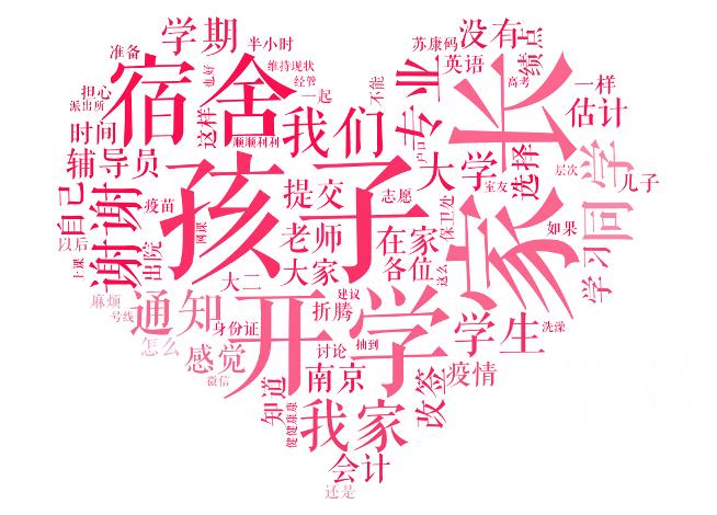 2020年3月正值疫情期间,群内聊天基本围绕学校关于疫情的安排展开:“开学”成了老生常谈,何时开学、能否开学牵动着家长的心,“改签”等词成为群内热词。“网课时代”开始后,聊天重心则逐渐转移到课程内容上:微积分对于文科生的难学程度、对孩子初步接触Python编程并举步维艰的担忧、孩子在家上课的精神状态……其中不乏家长们对上网课效果的质疑,也有对孩子学习境况的担忧。