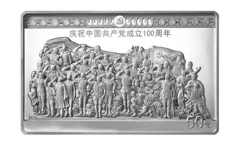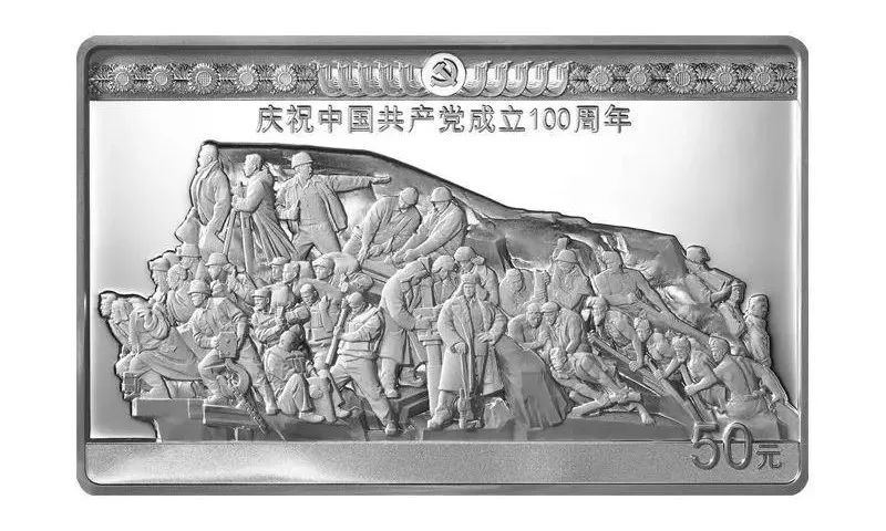 150克长方形银质纪念币背面图案为《攻坚》雕塑局部造型,辅以中国共产党历史展览馆馆徽等组合设计,并刊“庆祝中国共产党成立100周年”字样及面额。