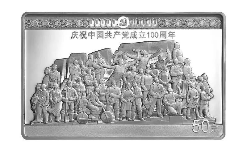 150克长方形银质纪念币背面图案为《伟业》雕塑局部造型,辅以中国共产党历史展览馆馆徽等组合设计,并刊“庆祝中国共产党成立100周年”字样及面额。