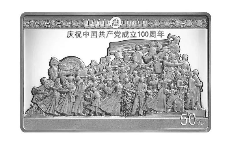 150克长方形银质纪念币背面图案为《信仰》雕塑局部造型,辅以中国共产党历史展览馆馆徽等组合设计,并刊“庆祝中国共产党成立100周年”字样及面额。