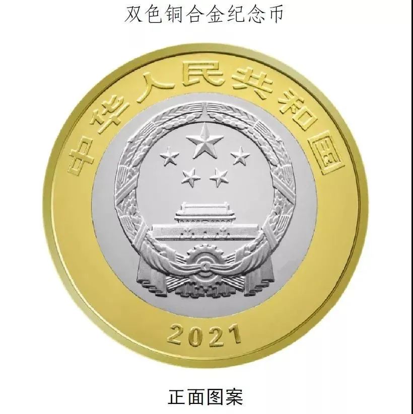 双色铜合金纪念币正面图案为中华人民共和国国徽,国徽上方刊“中华人民共和国”国名,下方刊年号“2021”字样。
