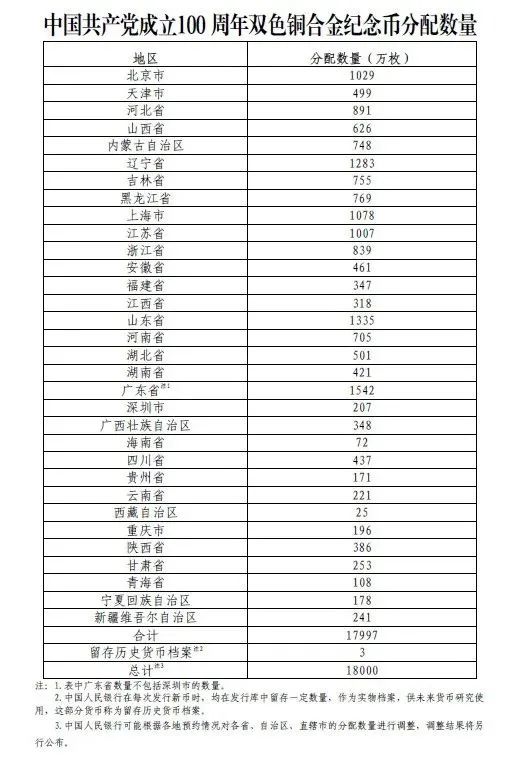 各省、自治区、直辖市双色铜合金纪念币分配数量如下: