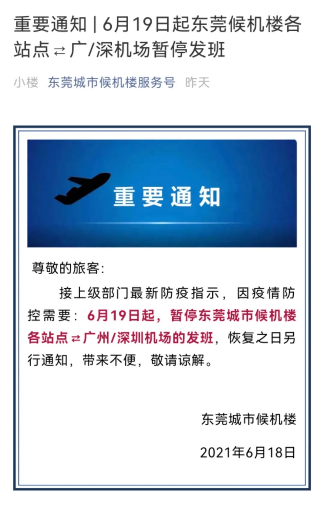 6月18日晚,东莞城市候机楼方面发布通知:因疫情防控需要:6月19日起,暂停东莞城市候机楼各站点⇄广州/深圳机场的发班,恢复之日另行通知。