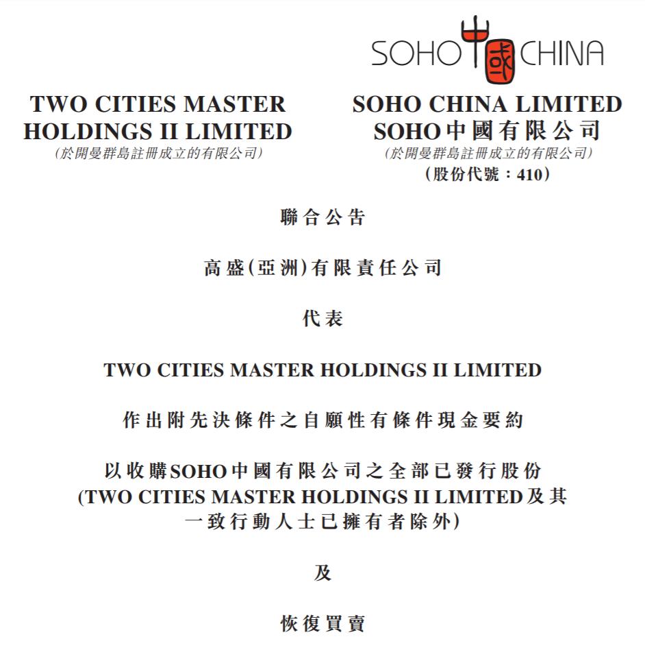 6月16日晚间,港股上市公司SOHO中国公告称,黑石集团对SOHO中国发出收购要约,以取得SOHO中国的控股权。