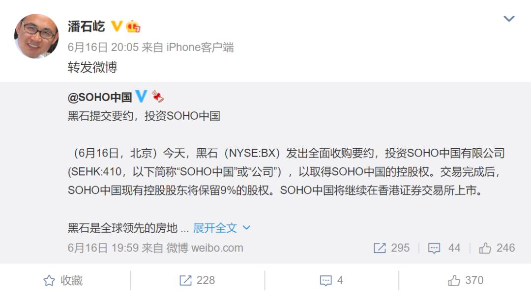 6月16日当晚,潘石屹第一时间在微博上转发了SOHO中国的官宣微博,没有任何配文,仿佛在向曾经的地产商身份做出最后的告别。