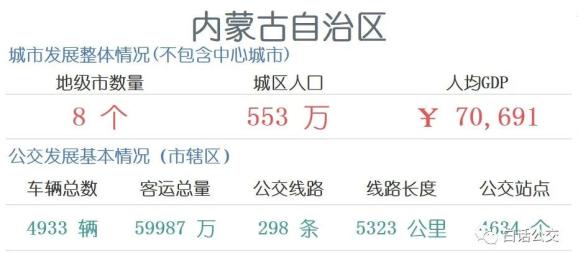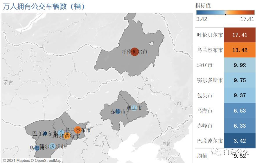 万人拥有公交车辆数:市辖区范围内万人拥有公交车辆数平均为9.52辆/万人,其中最大为呼伦贝尔市(17.41辆/万人),最小的为巴彦淖尔市(3.42辆/万人)。