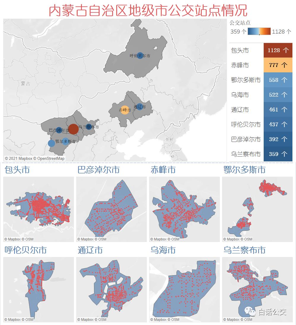 站点情况:8个地级市共有公交物理站点4634个,其中最多的为包头市(1128个),最少的为乌兰察布市(359个),平均站距993米。(包含城乡线路和城区线路)