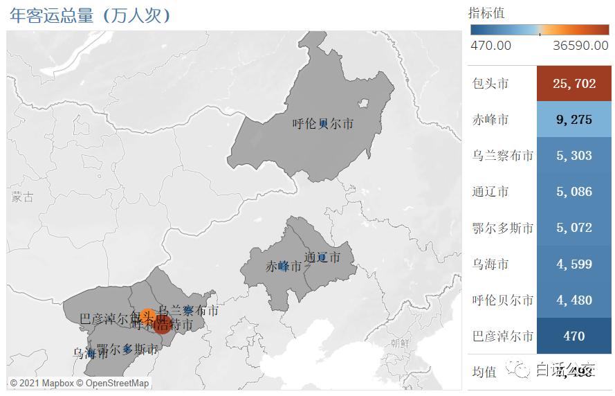 客运量情况:8个地市2019年共完成客运量59,987万人次,其中最多的为包头市(25,702万人次),最少的为巴彦淖尔市(470万人次)。
