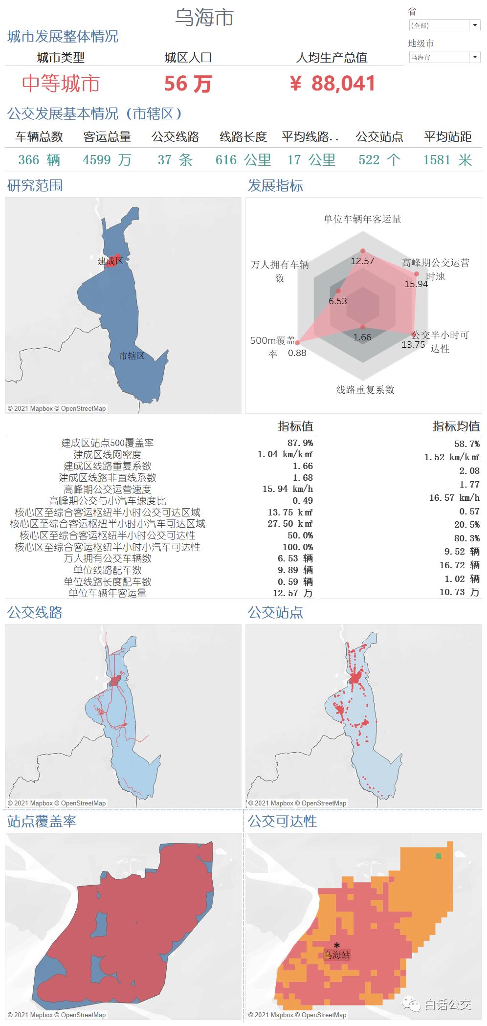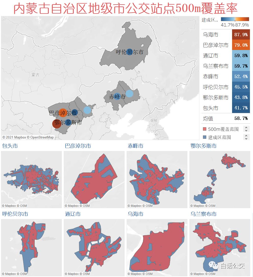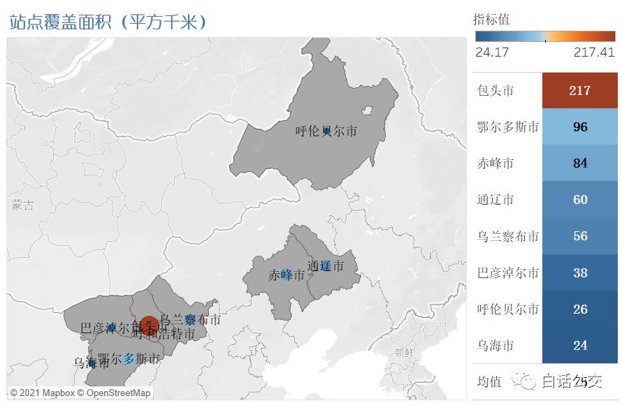 站点覆盖指标:中心城区建成区范围内公交站点500m平均覆盖率为59%,其中覆盖面积最大的为包头市(217平方公里),最小的为乌海市(24平方公里)。(未剔除范围内的江河绿地山地等)
