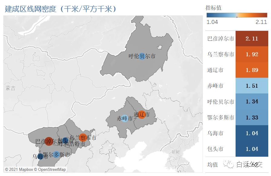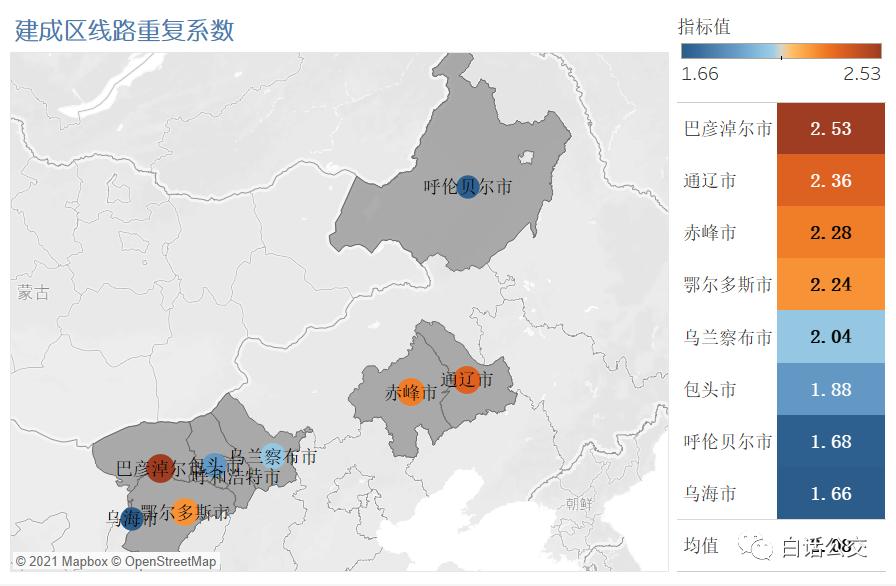 重复系数:中心城区建成区范围内公交线路重复系数平均为2.08,其中公交线路重复系数最大的为巴彦淖尔市(2.53),最小的为乌海市(1.66)。
