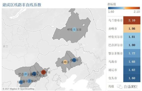 非直线系数:8个地市中心城区建成区范围内公交线路非直线系数平均为1.77,其中公交线路非直线系数最大的为乌兰察布市(2.1),最小的为包头市(1.6)。