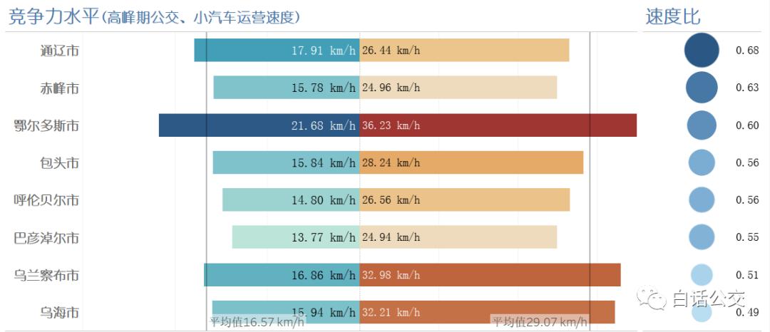 公交与小汽车运营时速比:中心城区建成区范围内公交与小汽车运营时速比平均为0.57,其中公交与小汽车运营时速比最大的为通辽市(0.68),最小的为乌海市(0.49)。