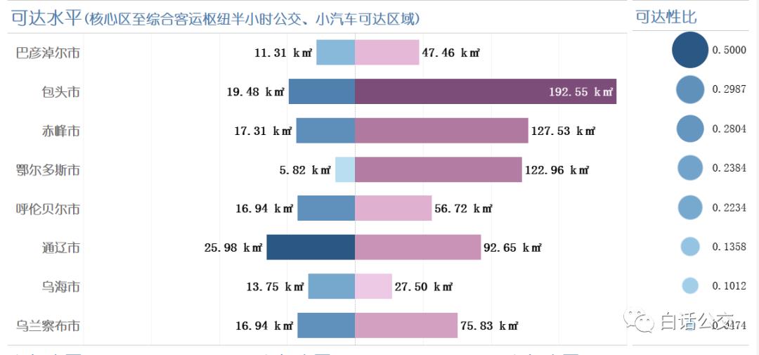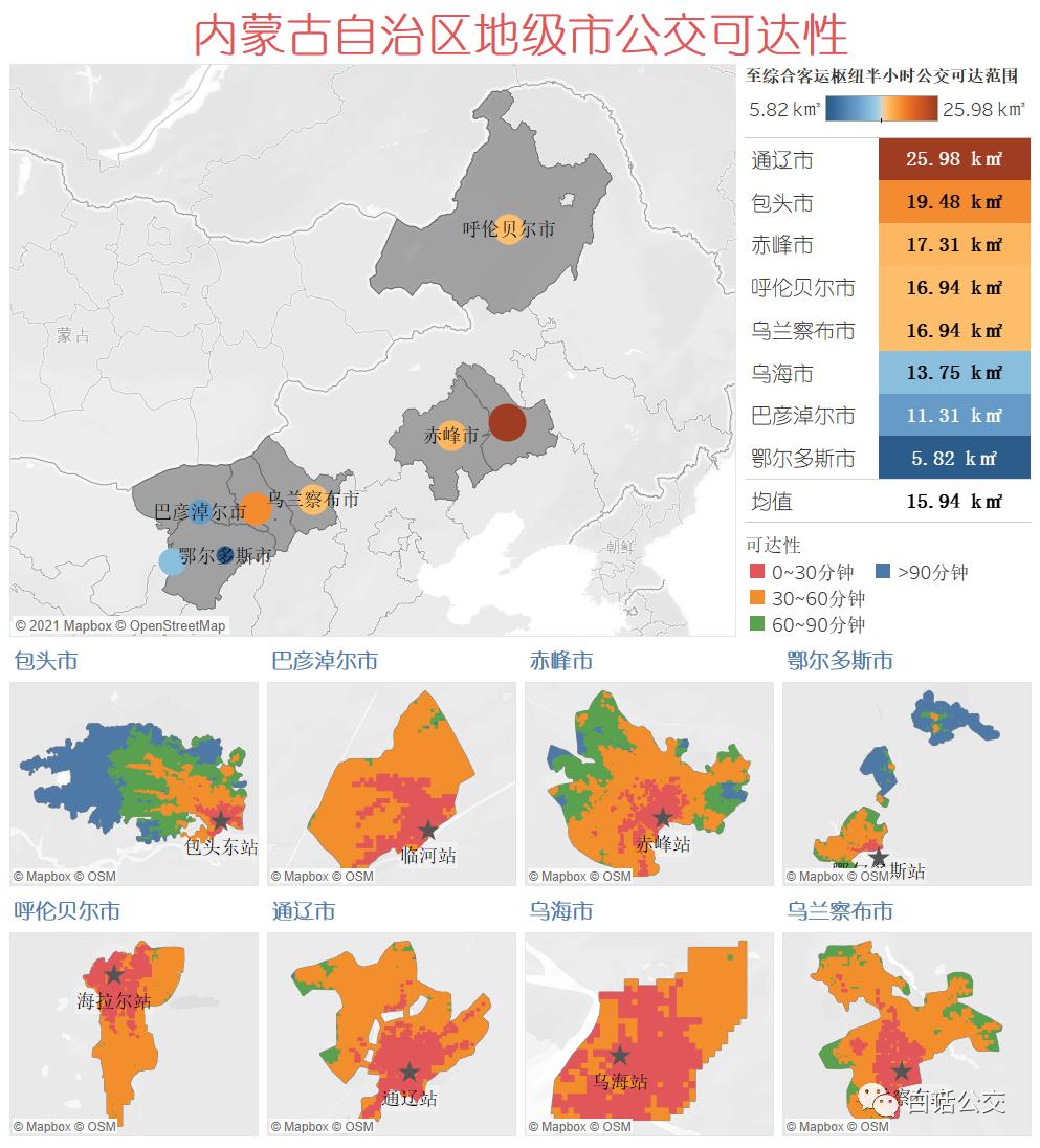 可达性水平:综合客运枢纽半小时公交可达覆盖范围平均为15.94平方公里,其中最大的为通辽市(25.98平方公里),最小的为鄂尔多斯市(5.82平方公里)。