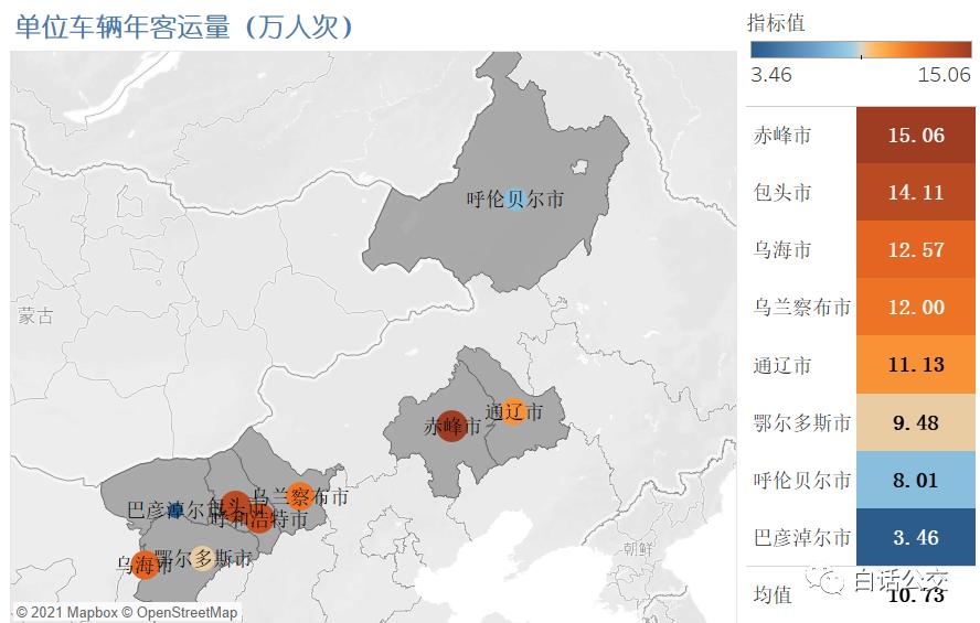 单位车辆客运量:市辖区范围内单位车辆年客运量平均为10.73万人次,其中最大为赤峰市(15.06万人次/年),最小的为巴彦淖尔市(3.46万人次/年)。