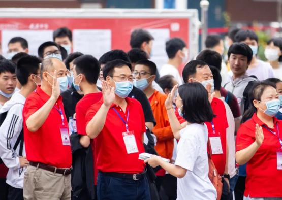 6月20日,武汉中学考点,前来送考的华一寄宿学校老师列队和考生们击掌,为考生们加油鼓劲。(湖北日报全媒记者柯皓 摄)
