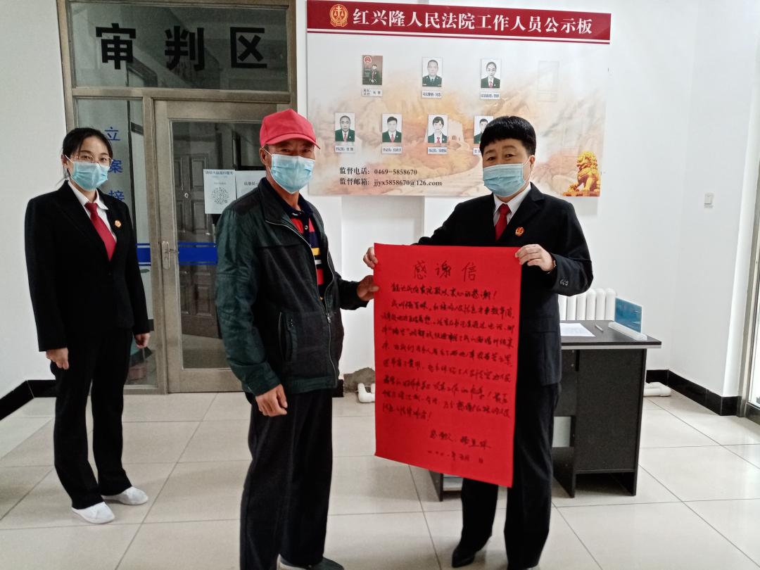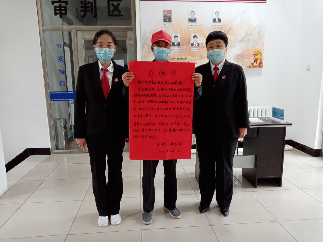 案件受理后,承办法官张慧立即与被告王某某取得联系,了解到双方仅仅是因为现实原因长期异地分居无法共同生活,导致夫妻感情破裂,现在唯一的争议点就是如何分配夫妻双方共有的房产。承办法官认为该案有调解基础,遂与原被告双方进行了深入的沟通,王某某由于已久未归红旗岭农场,对现阶段房产价值了解不足,因此,与杨某某就房产分割产生较大争议。承办法官巧用微信逐句耐心讲解,释法明理,并与被告亲属实地走访当地房产交易价格,最终双方当事人自愿达成了调解协议。在房屋按调解协议如期完成过户后,原告杨某某向红旗岭人民法庭送来了感谢信,感谢法院不仅调解了他的离婚纠纷,也化解了原被告的矛盾,现原被告虽无夫妻关系但仍有情谊。
