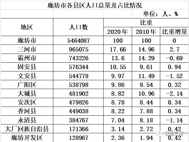 从廊坊市各县区常住人口的总量来看,我市常住人口总量占全廊坊市的17.66%,比2010的14.96提高了2.7个百分点,在人口总量、人口比重及人口比重增量上均位居廊坊市第一位(见下表)。