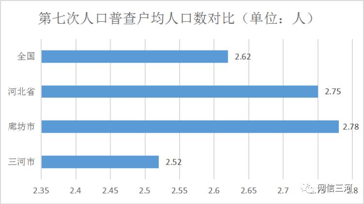 全市共有350946户,其中:家庭户335512户,总人口为845033人;集体户15434户,总人口为120042人。平均每个家庭户的人口为2.52人,比2010年的3.52人减少1人,较全国、河北省和廊坊市户均人口数分别低0.1人、0.23人和0.26人。家庭户规模继续缩小,主要受人口流动日趋频繁、住房条件改善、年轻人婚后独居增加、生育率下降、家庭子女数量减少等因素的影响(见下图)。