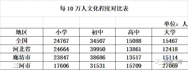 数据显示我市每10万人拥有的高中、大学文化程度的人口数量均高于全国、河北省和廊坊市的平均值,体现出我市近年来高质量教学和人才引进方面都取得了显著效果(见下表)。