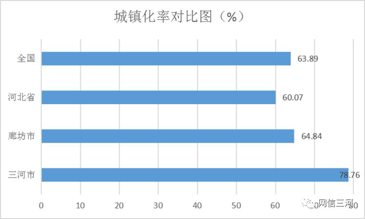 过去10年间,我市城市基础设施建设投资迅猛发展,功能日趋完善,城市承载能力大幅提升,为人口向城市快速聚集奠定良好基础。2020年,全市居住在城镇的人口达到760107人,占全市常住人口总量的78.76%,城镇人口年均增长7.0%;居住在乡村的人口为204968人,占全市常住人口总量的21.24%。与2010年相比,全市城镇人口增加373205人,乡村人口减少60172人,10年间城镇化率提高19.42个百分点。我市城镇化率与全国、河北省和廊坊市比分别高14.84、18.69和13.92个百分点(见下图)。